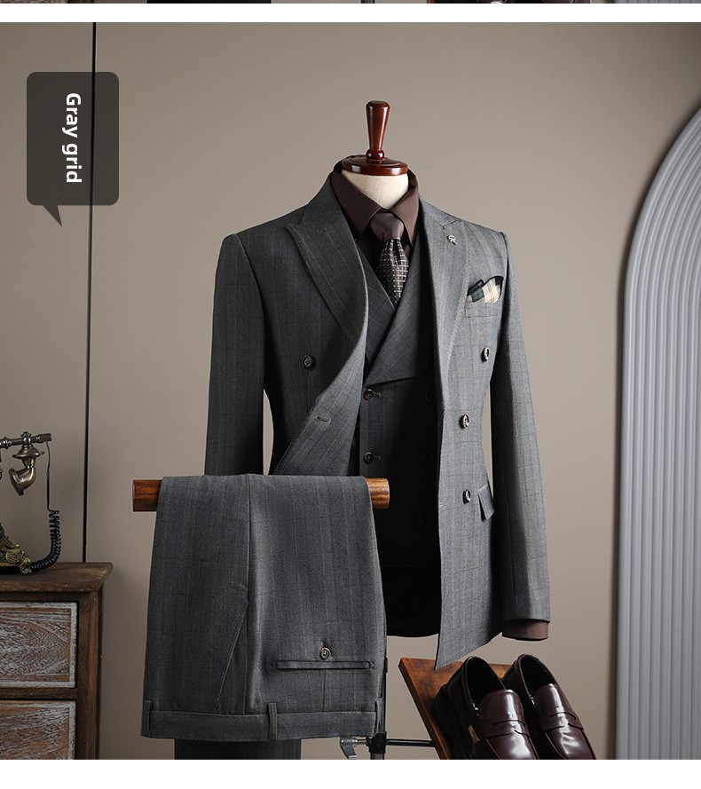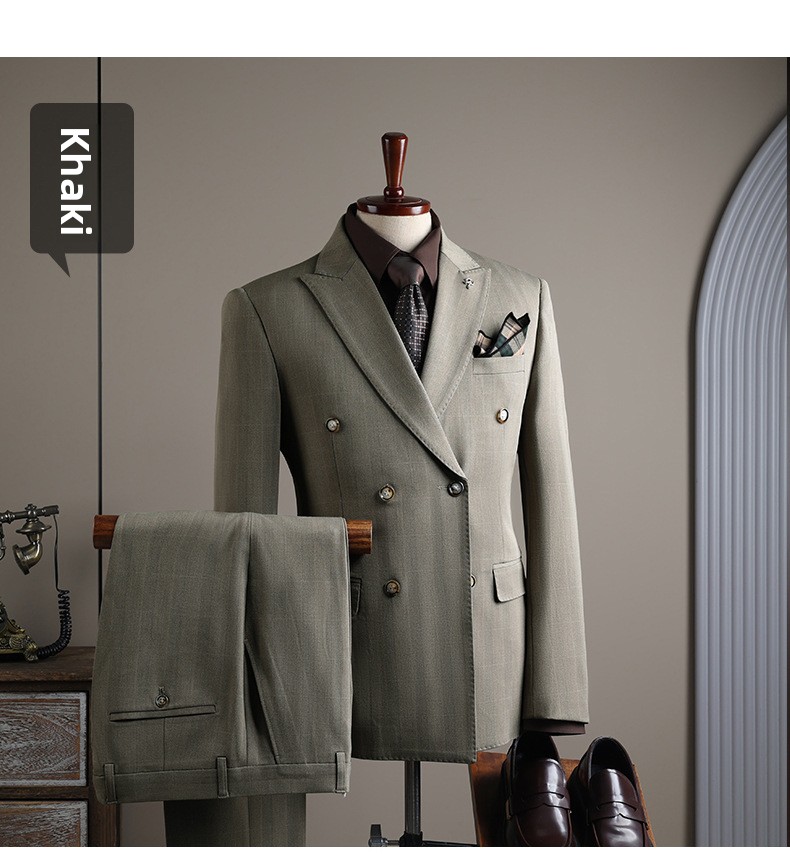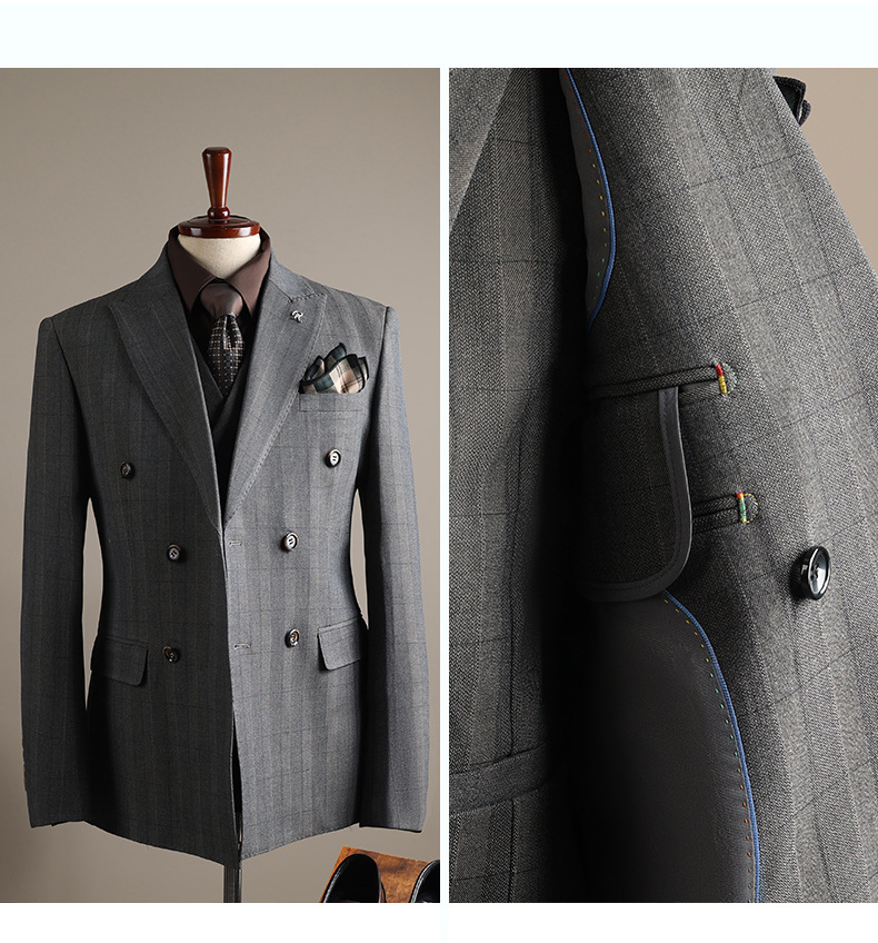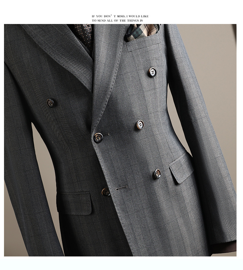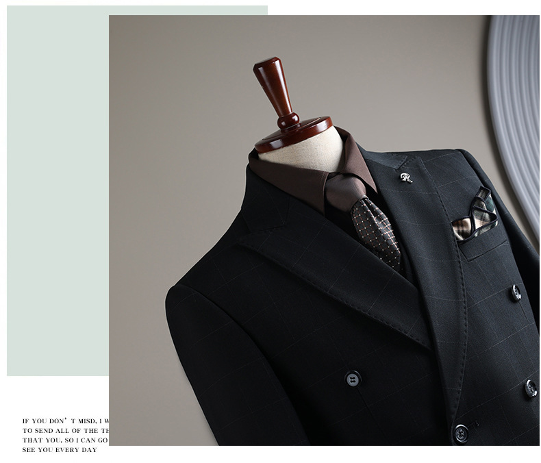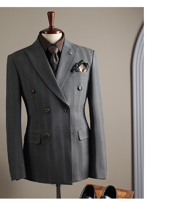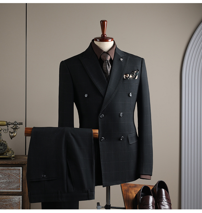 Double-row plaid design: Stylish and modern business suit with a distinctive checkered pattern.