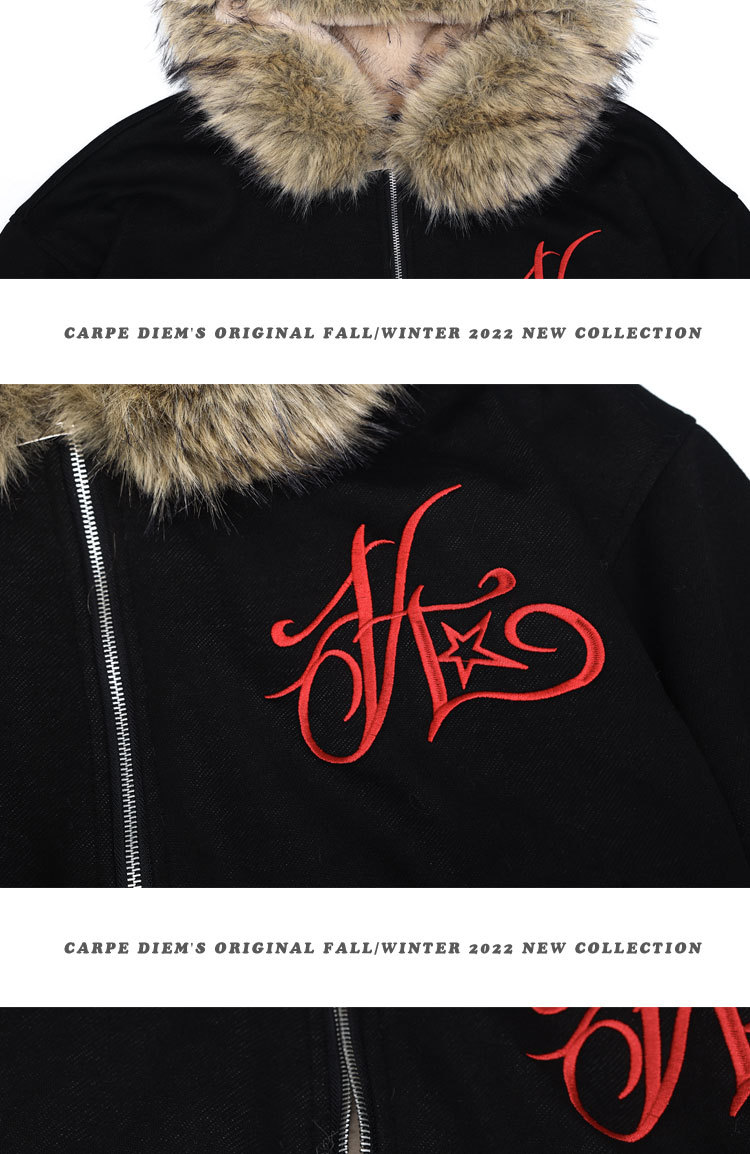 Design: Patch decoration, straight hem, no hood