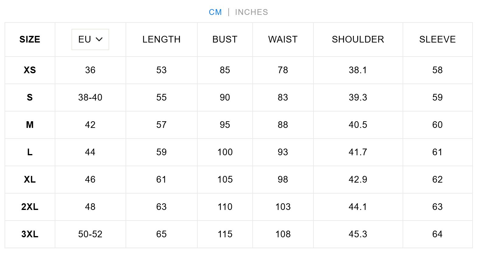 Sizes: XS, S, M, L, XL, 2XL, 3XL