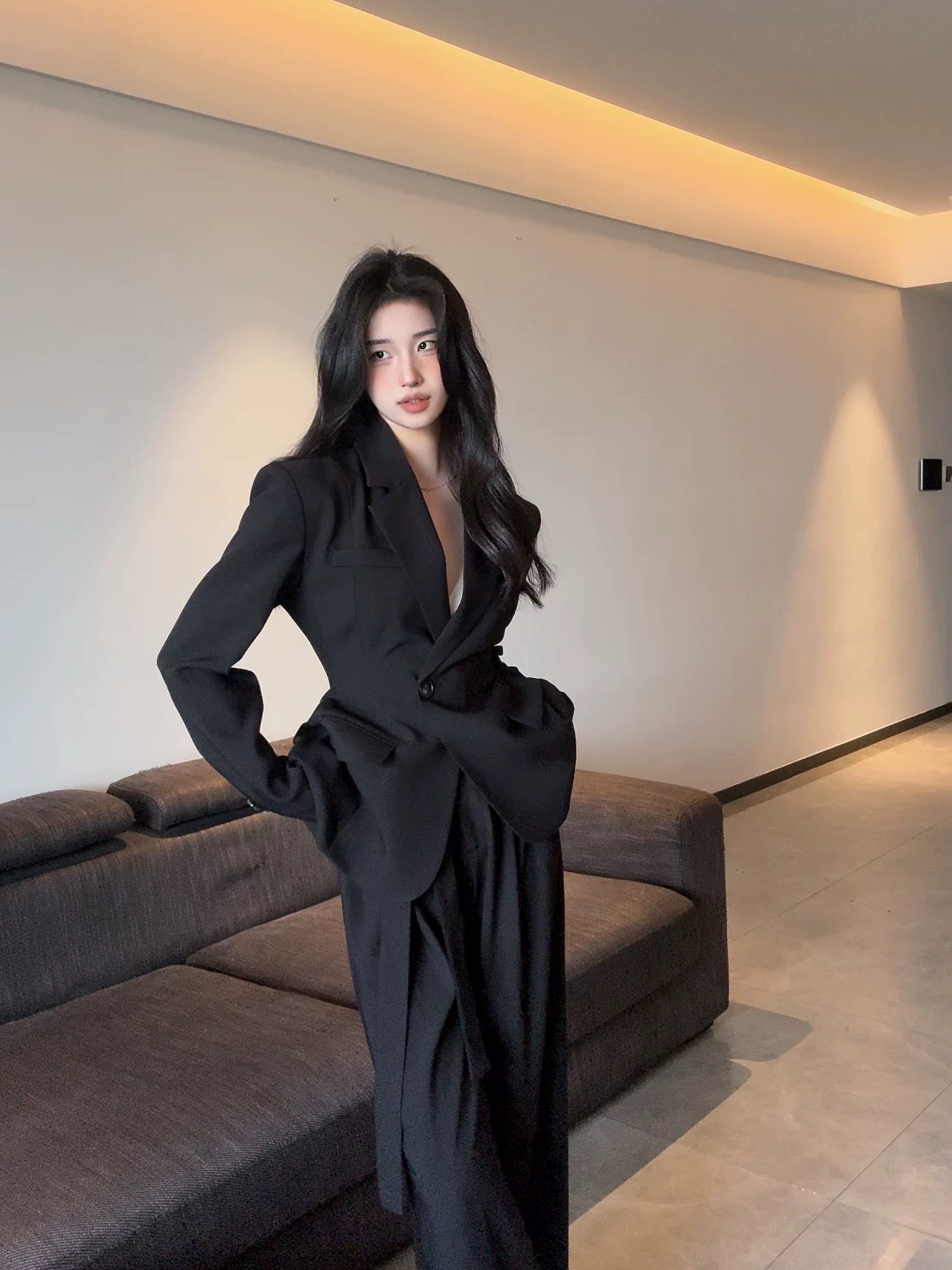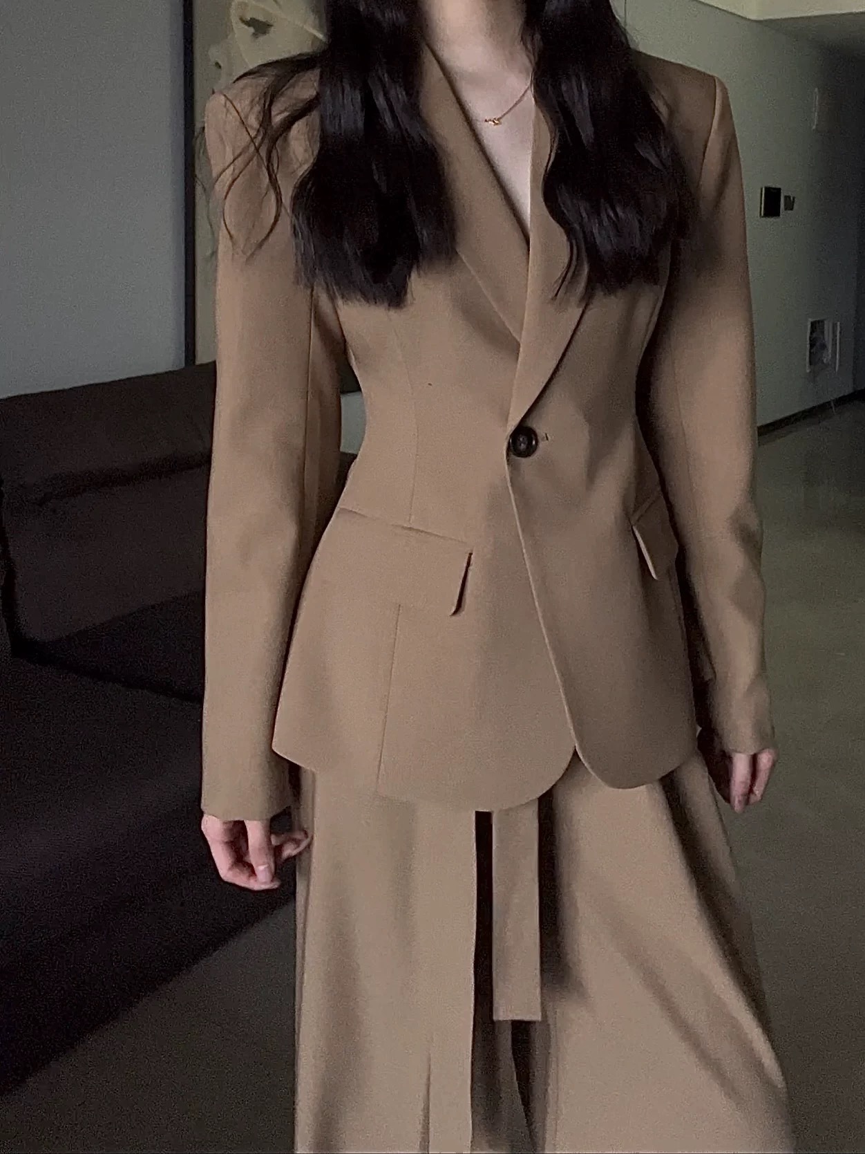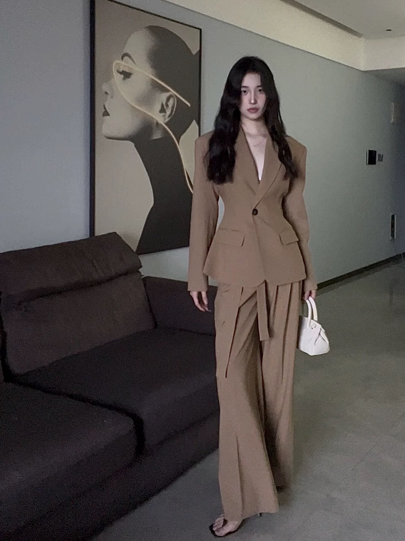 Elegant Design: Tailored waist-cinching silhouette with wide-leg pants for sophisticated commuting style