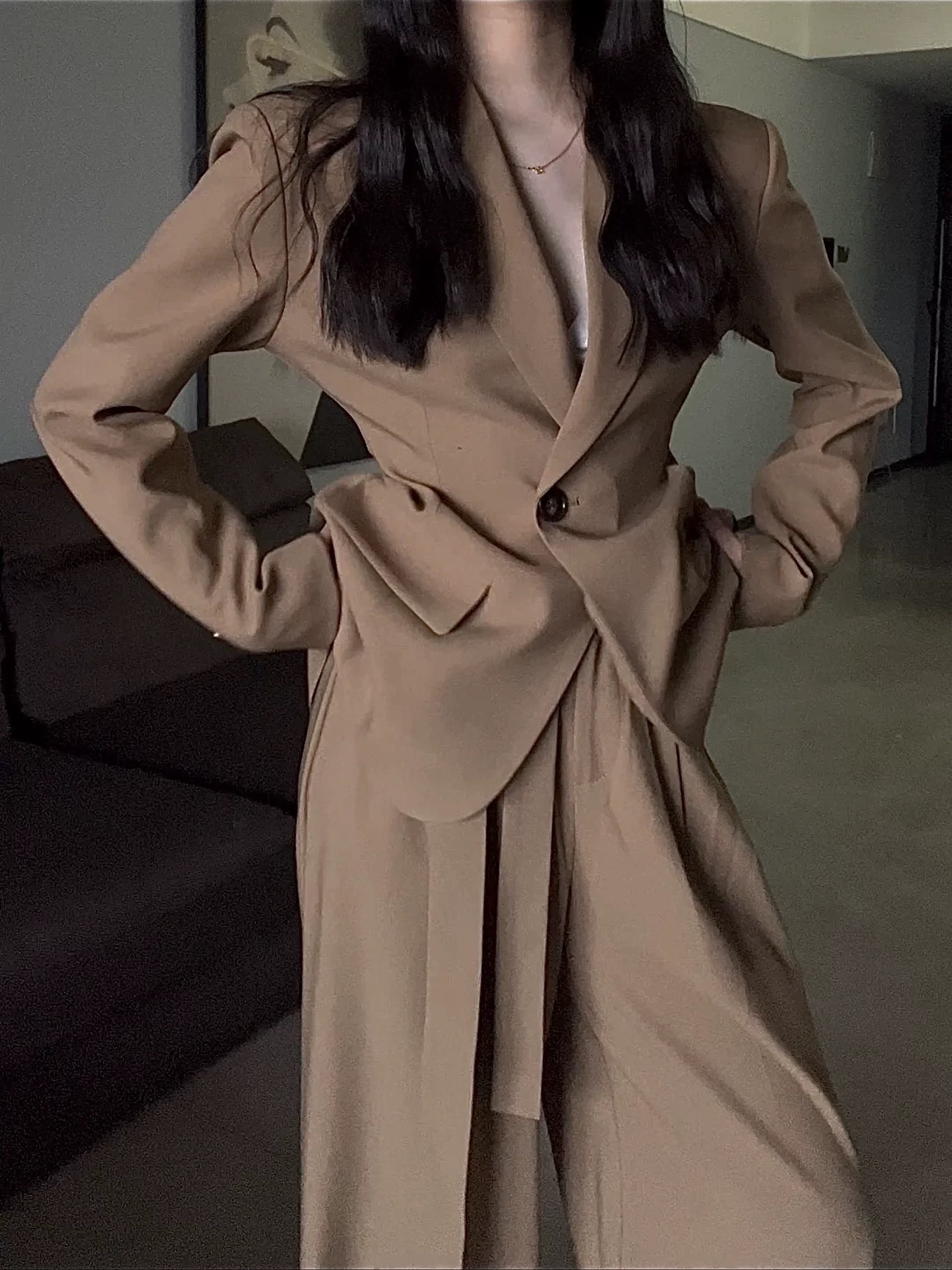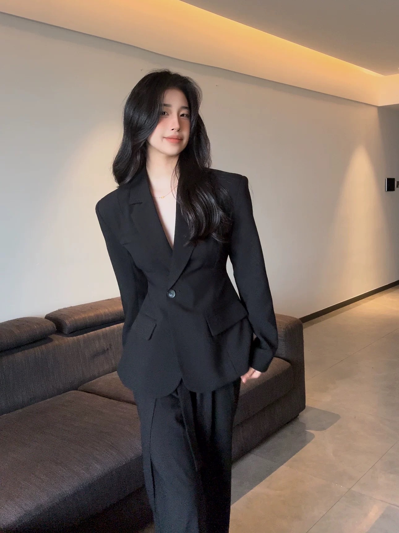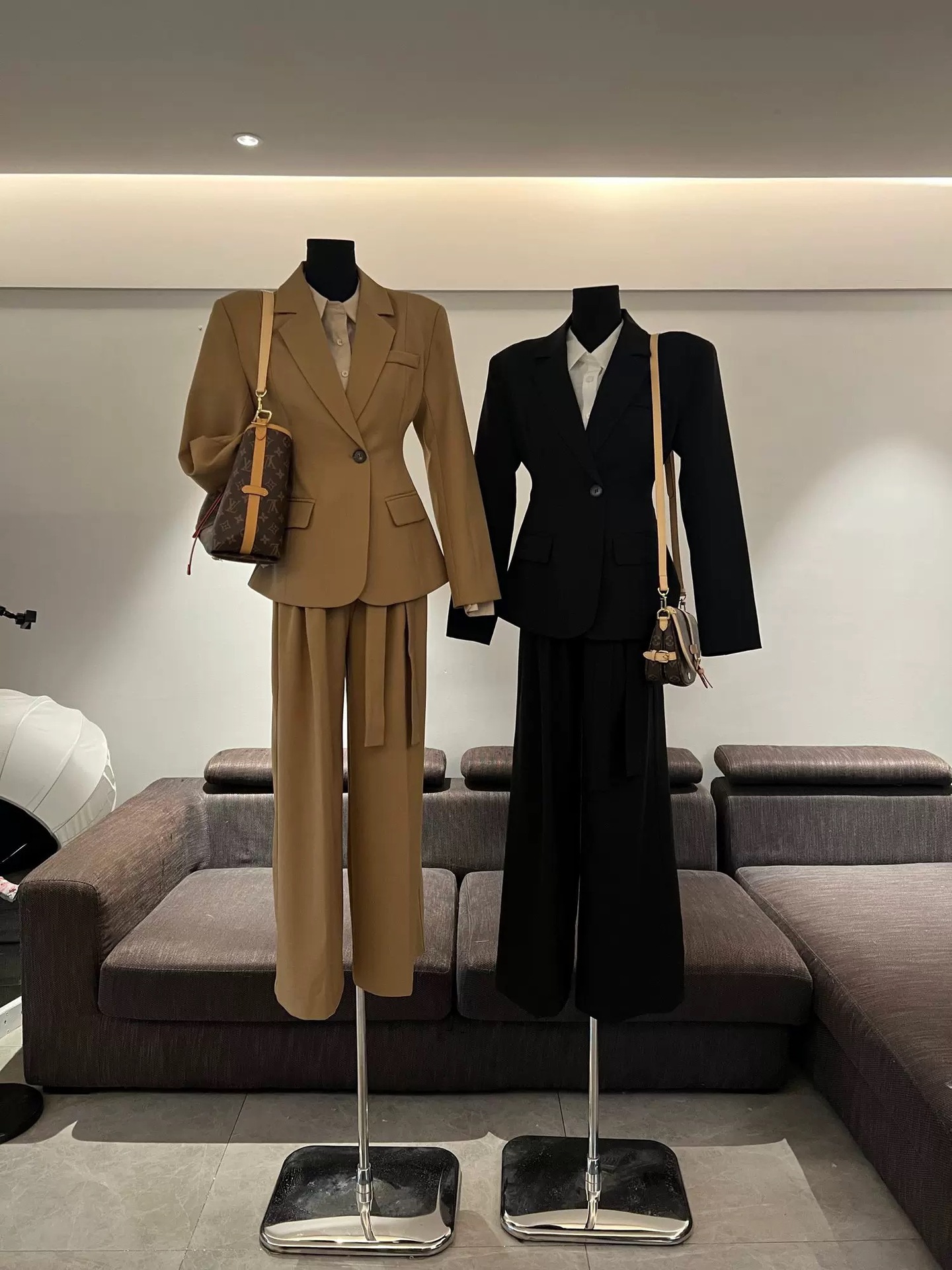 Elegant Design: Tailored waist-cinching silhouette with wide-leg pants for sophisticated commuting style
