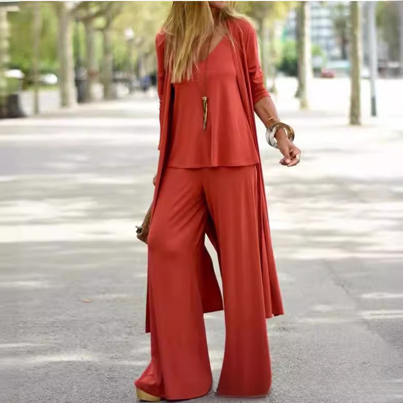 Loose Three-Piece Set with V-Neck Camisole, Long Cardigan, and Straight-Leg Trousers