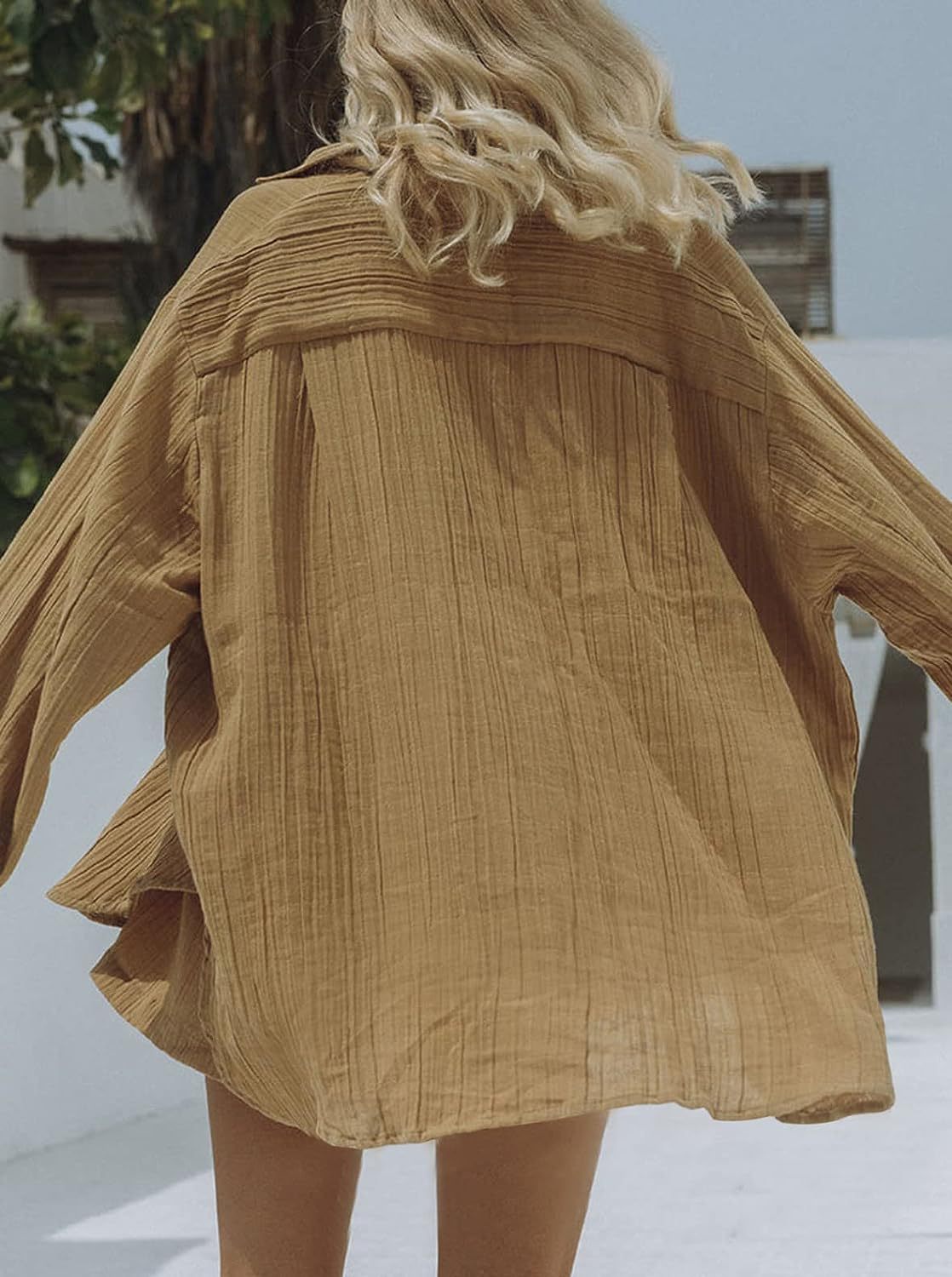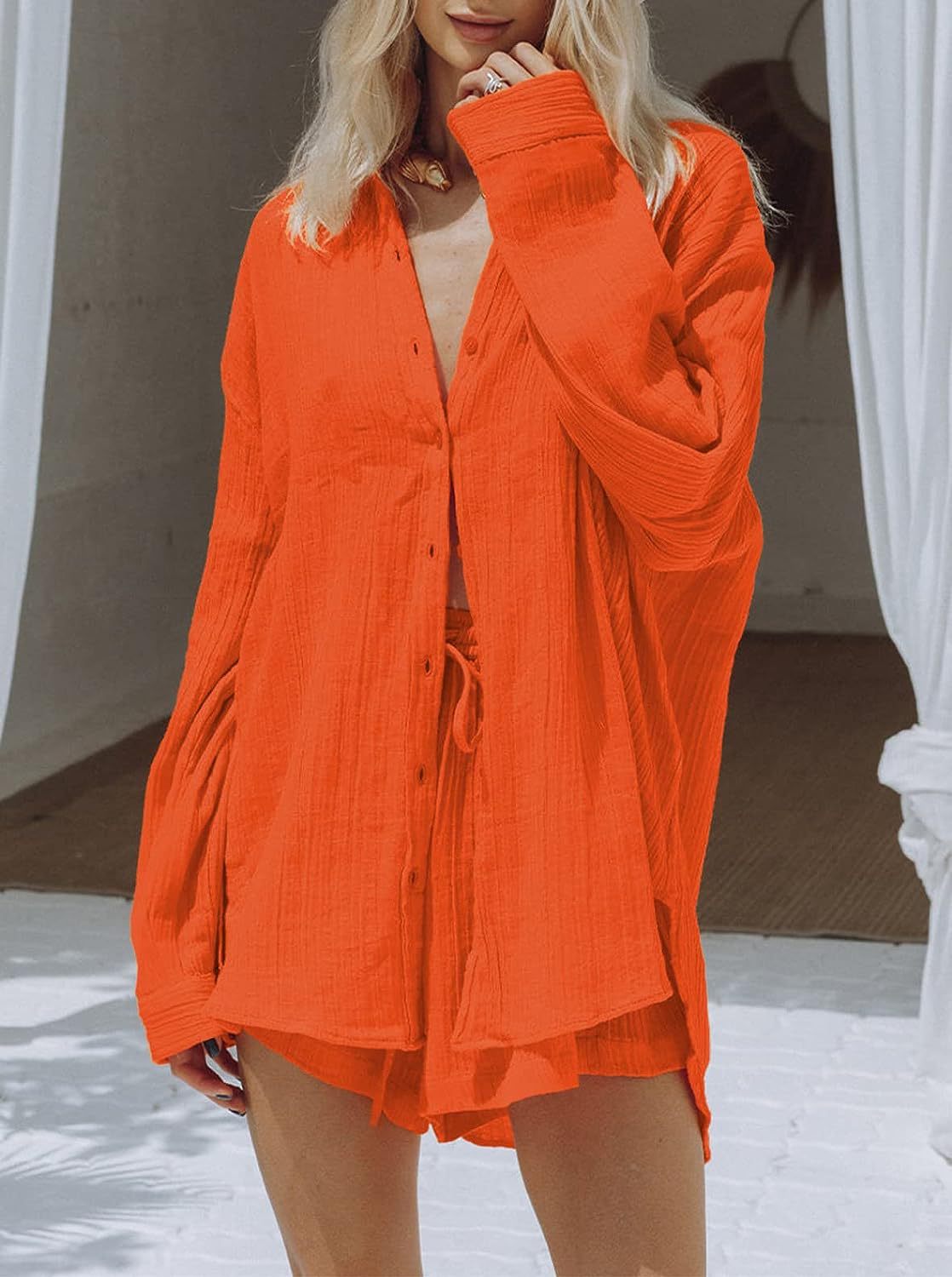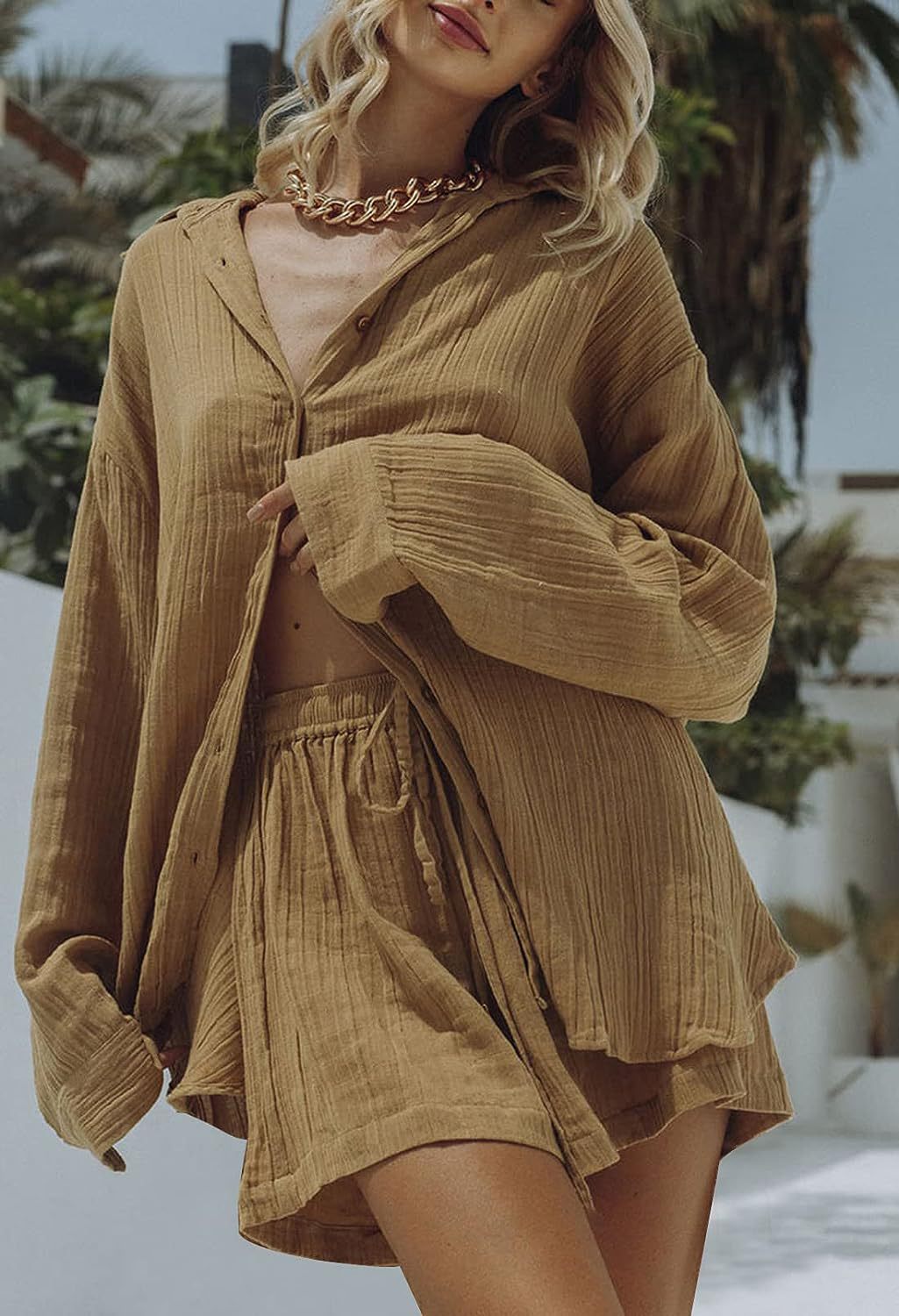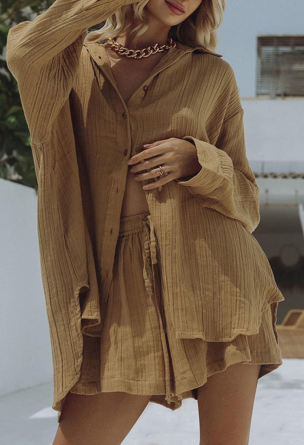 Women's Casual Long Sleeve Shirt and Shorts Two-Piece